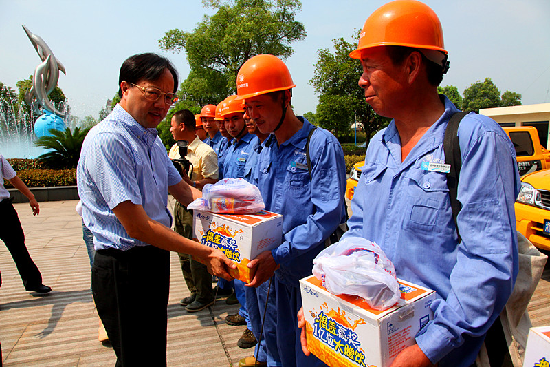 7月12日上午,縣委書記何加順、副縣長周樹森等領(lǐng)導(dǎo)在水務(wù)集團(tuán)董事長倪阿泉、總經(jīng)理單寶子等領(lǐng)導(dǎo)陪同下來到公司慰問在高溫下作業(yè)的供水一線職工,親手把防暑降溫慰問品送到他們手上,并再三叮囑有關(guān)人員落實好夏季高溫時段的防暑降溫措施,確保一線職工身體健康。